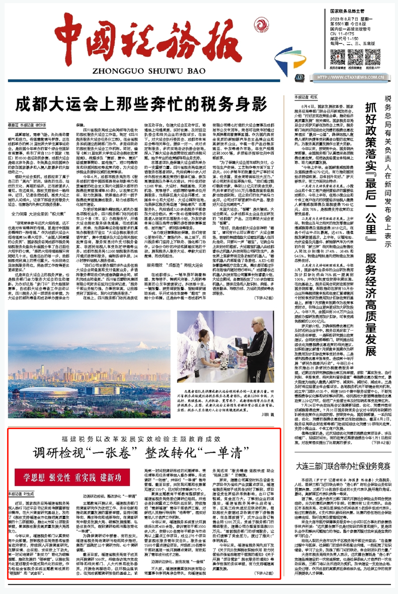 今年以来,福建税务部门认真贯彻党中央部署,按照税务总局党委和省委省政府要求,持续深入开展调查研究,在察实情、出实招、求实效上下功夫,第一时间将调研“软实力”转化为破解难题、推动发展的“硬举措”。以税收现代化更好服务中国式现代化的实效,作为检验全省税务系统主题教育成果的“硬指标”和“试金石”。